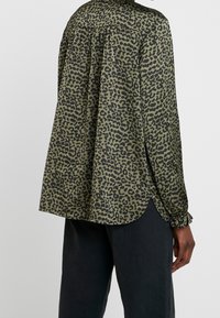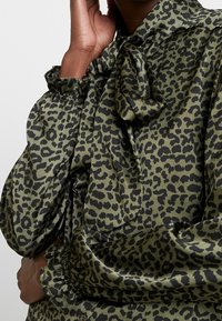 Blouse verte en tissu léger présentant un imprimé animalier noir et vert pâle, col en V, et manches longues avec poignets froncés.