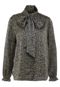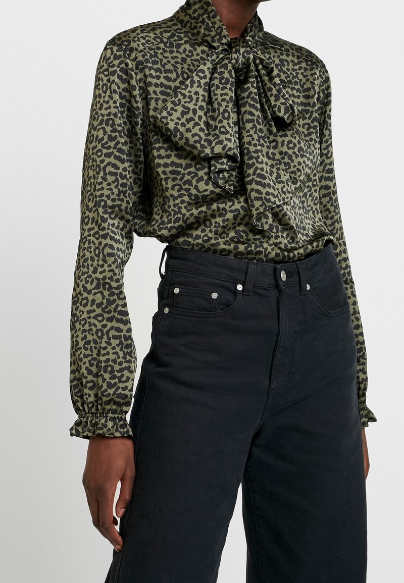 Blouse vert olive avec imprimé léopard noir et un nœud noué au col, associée à un pantalon noir taille haute.