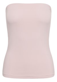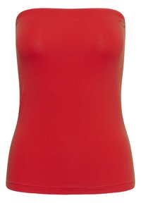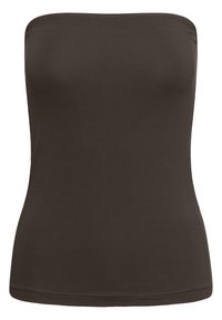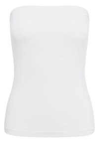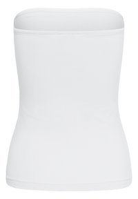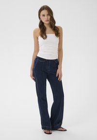 Femme aux longs cheveux bruns portant un haut blanc sans bretelles et un jean taille haute bleu foncé, debout devant un fond clair uni.