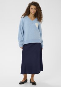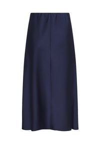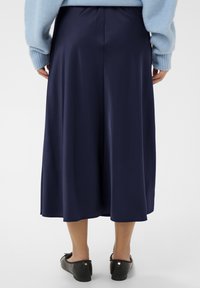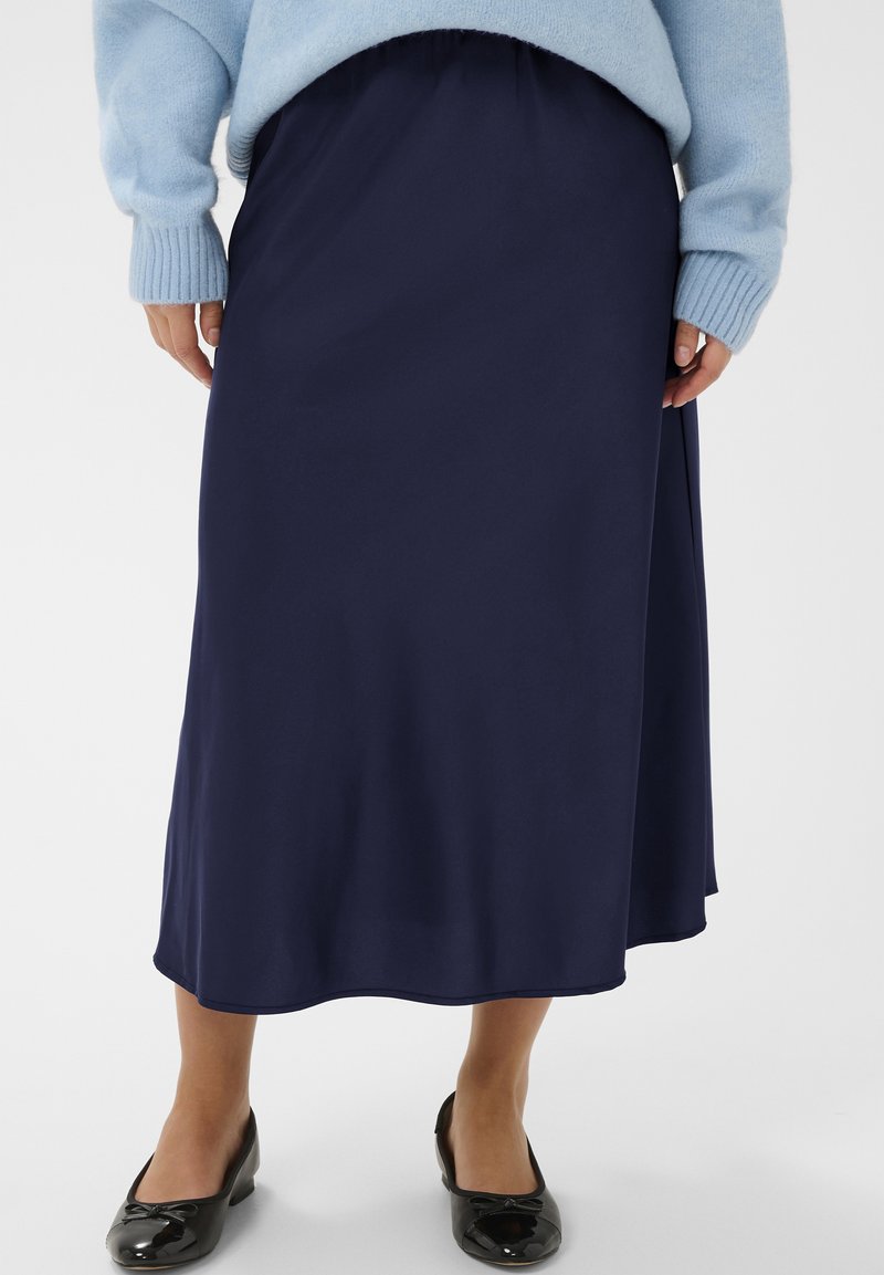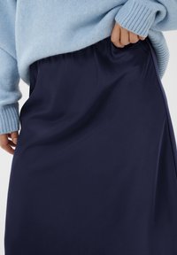 Jupe midi bleu marine avec taille élastique, texture lisse et coupe fluide. Associée à des ballerines noires ornées d'un nœud.