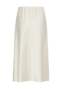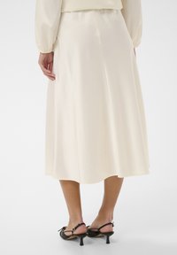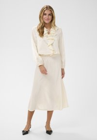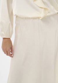 Femme portant une jupe midi en satin crème et une blouse assortie à manches longues, avec des escarpins slingback noirs à bouts pointus ornés de nœuds.