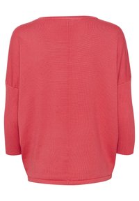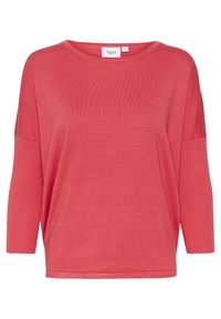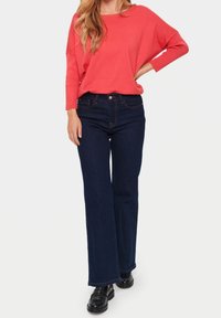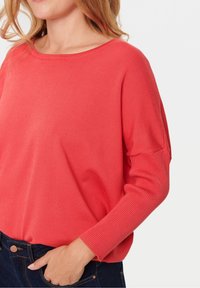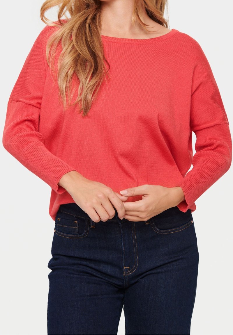 Femme portant un pull corail à manches longues et un jean bleu foncé, mains jointes à la taille, avec des cheveux blonds ondulés tombant sur l'épaule.