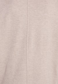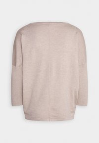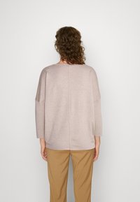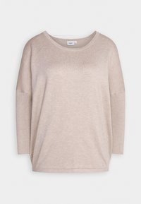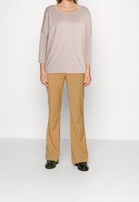 Femme portant un pull ample beige à manches trois-quarts et un pantalon couleur camel, sur un fond uni.