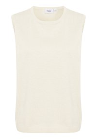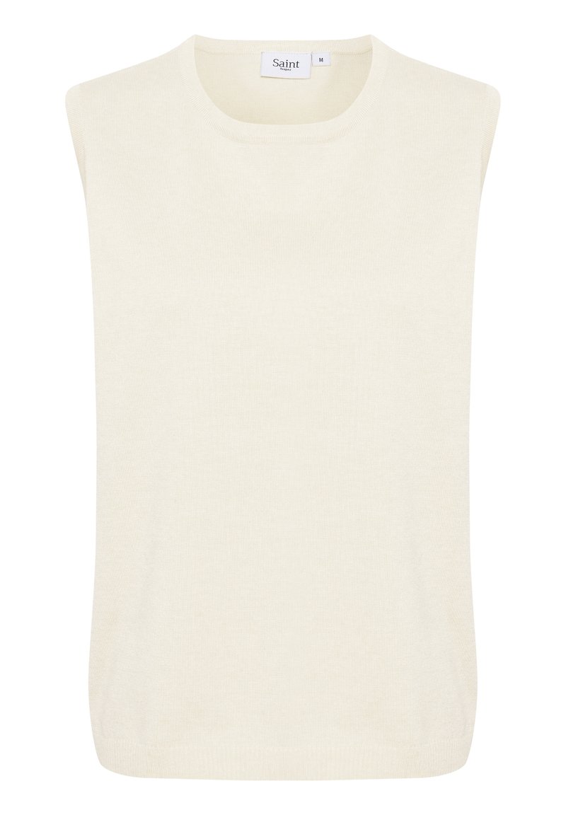 Gilet en tricot sans manches de couleur crème avec un col rond et une petite étiquette de marque au niveau du col.