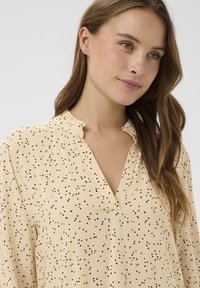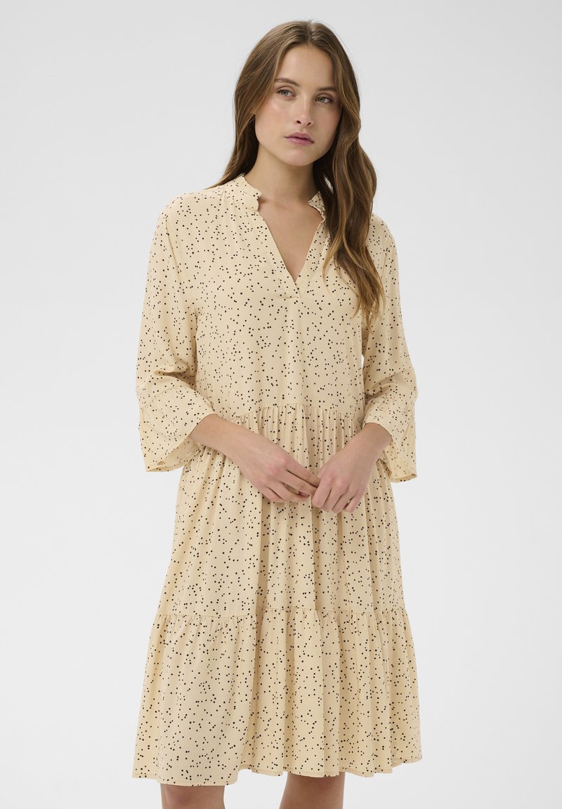 Robe beige à volants, avec un décolleté en V, des manches longues et un motif de petits points noirs dispersés sur un tissu doux.