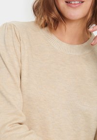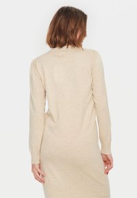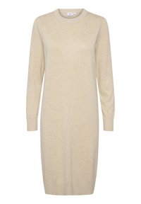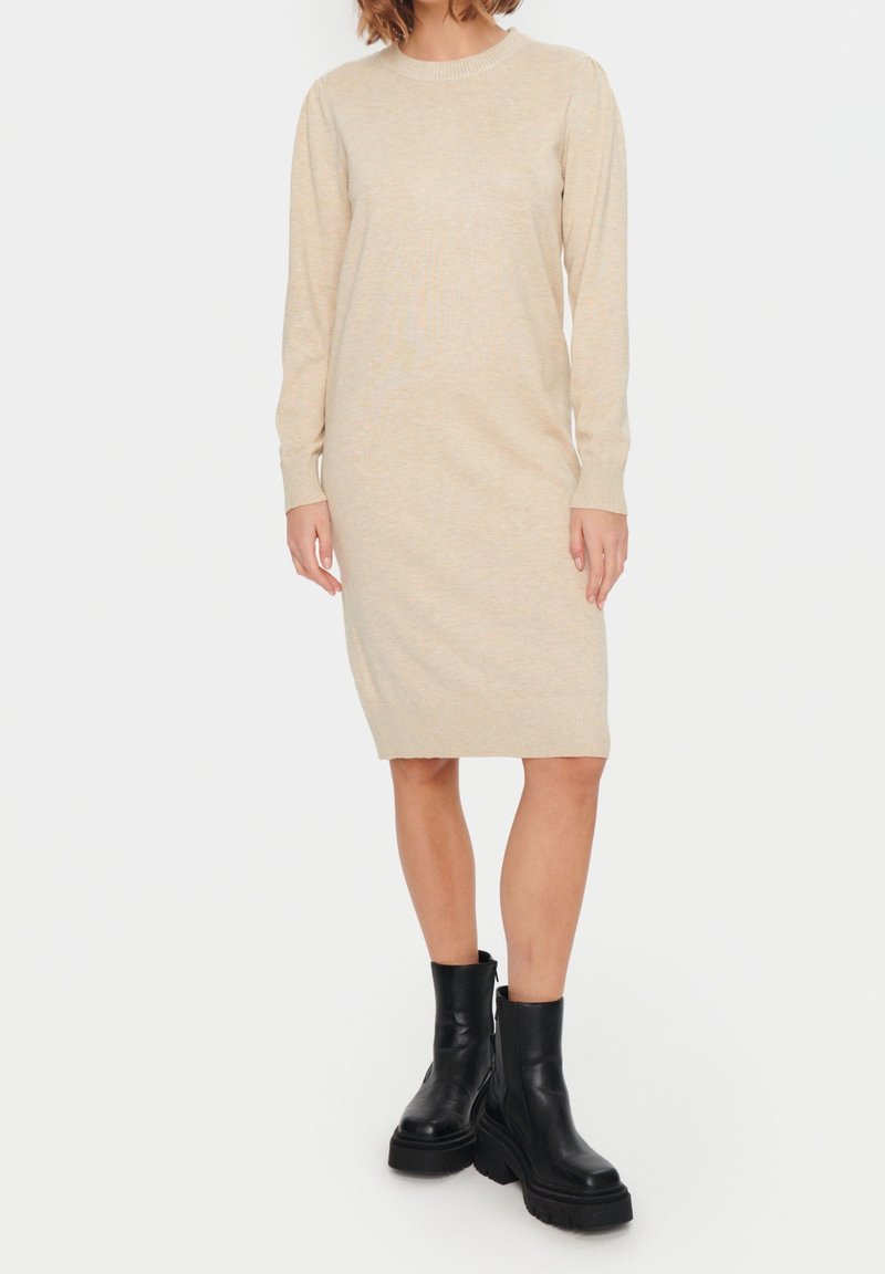 Robe en maille beige à manches longues, encolure ronde et poignets côtelés, associée à des bottines noires à semelle épaisse.