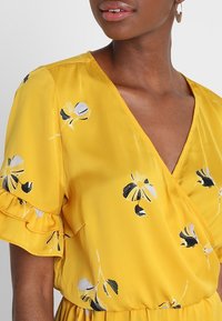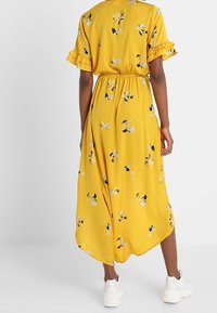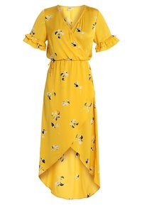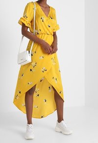 Robe portefeuille fleurie jaune avec manches courtes à volants et ourlet asymétrique, portée avec des baskets blanches épaisses.