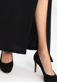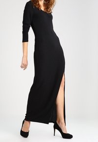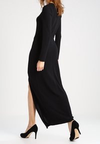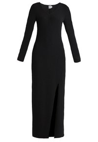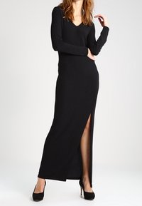 Femme portant une longue robe noire à encolure en V, manches longues et fente haute sur la cuisse, assortie à des chaussures à talons noirs.