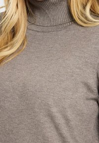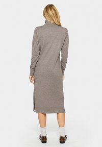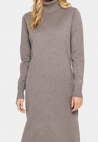 Modèle féminin portant une robe midi en tricot taupe à col roulé et manches longues, avec des fentes latérales, des chaussettes blanches et des mocassins en cuir marron.