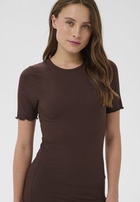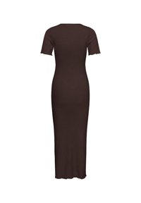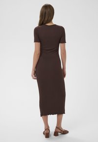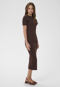 Femme aux longs cheveux bruns portant une robe midi brune ajustée à manches courtes côtelée et des escarpins slingbacks tressés bruns, debout sur un fond blanc.