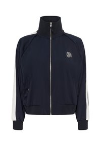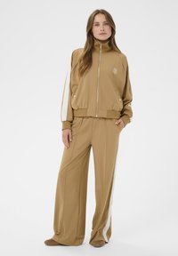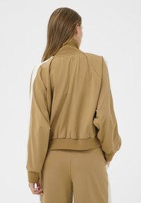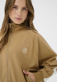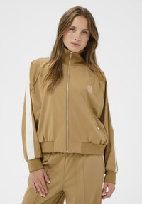Veste zippée beige avec col haut et bandes blanches sur les côtés. Présente un léger brillant, des poignets élastiques et une poche frontale avec fermeture à pression.