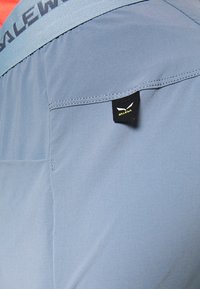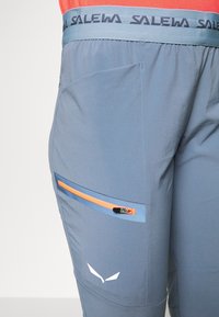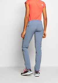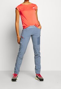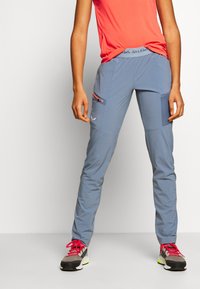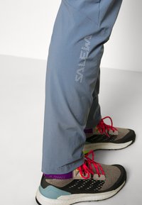 Personne portant un pantalon de randonnée bleu avec une poche zippée sur la cuisse et des chaussures de randonnée grises avec des lacets roses, debout devant un fond uni.