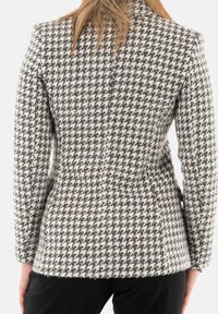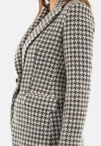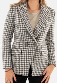 Femme portant un blazer pied-de-poule noir et blanc sur un haut beige, avec un pantalon noir et un bracelet violet au poignet gauche.