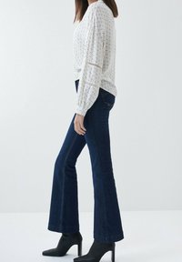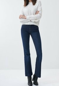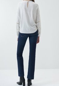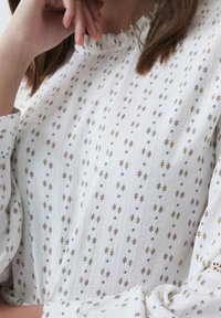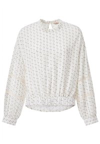 Blouse blanche légère avec petit imprimé floral, manches longues et taille élastique. Les manches longues sont ornées de détails en dentelle aux poignets. Portée avec un jean foncé.