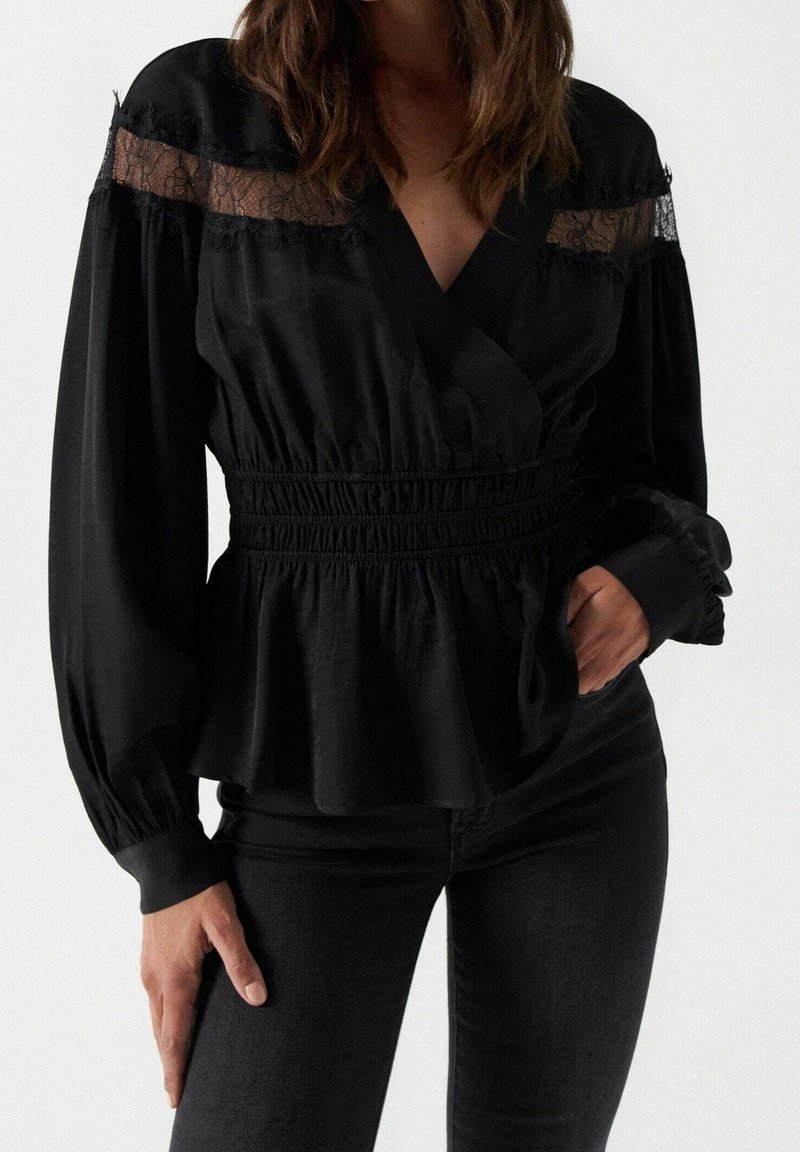 Blouse noire avec un design cache-cœur, taille smockée, manches longues, accents en dentelle transparente sur les épaules, et un tissu doux et texturé.