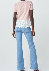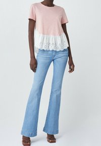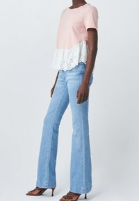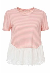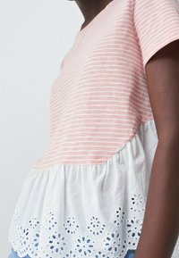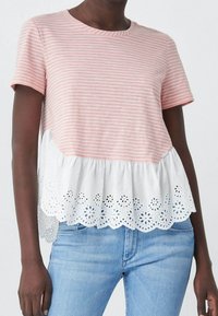 Femme portant un chemisier à manches courtes rose clair et blanc avec des rayures horizontales et un ourlet en dentelle ajourée, associé à un jean bleu.