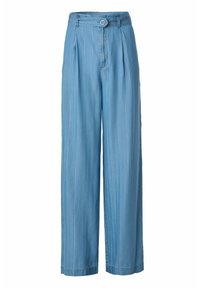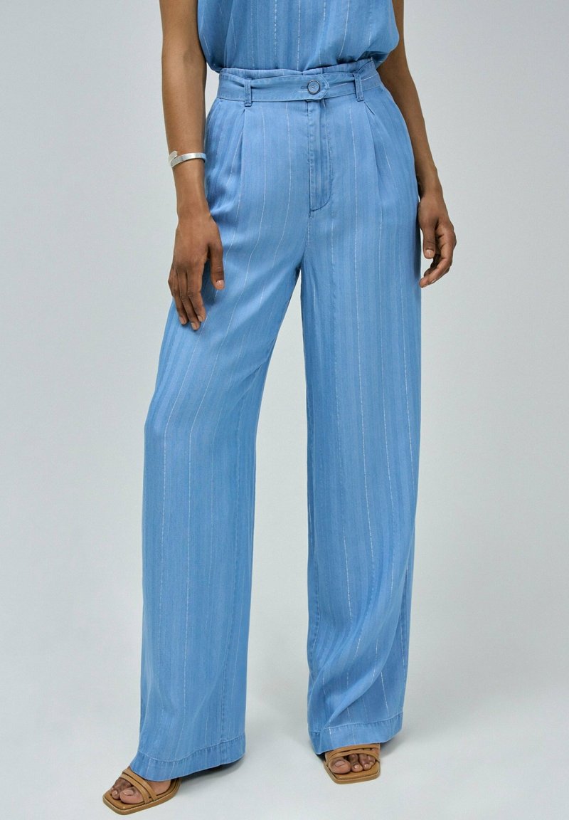 Pantalons bleu clair, taille haute, larges, avec des rayures verticales, dotés d'une ceinture et d'une fermeture à boutons sur le devant. Texture de tissu lisse.