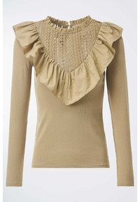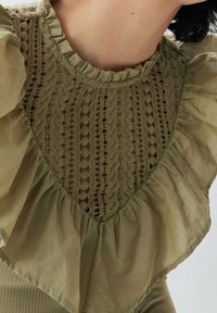 Femme portant un haut côtelé à manches longues de couleur vert olive avec des détails en dentelle et des volants, associé à un jean bleu foncé taille haute.