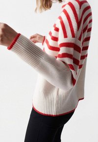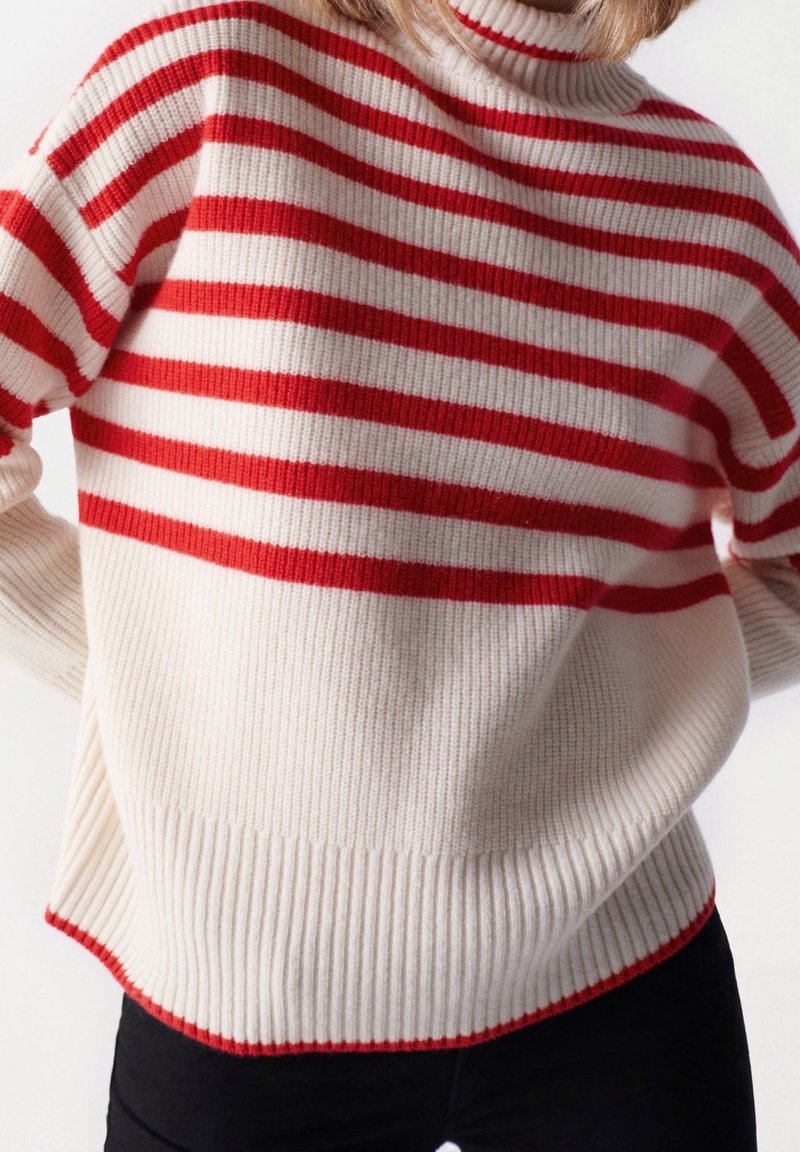 Personne portant un pull blanc côtelé avec des rayures horizontales rouges et un ourlet bordé de rouge, associé à un pantalon noir.