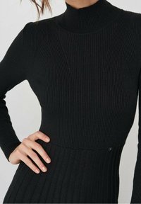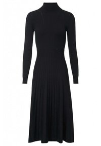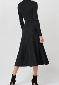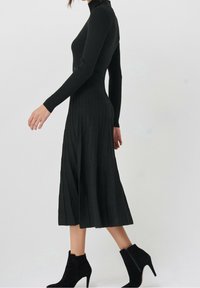 Robe en tricot côtelé noir avec un col haut, des manches longues et une jupe plissée qui tombe à mi-mollet. Portée avec des bottines noires.