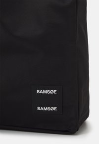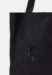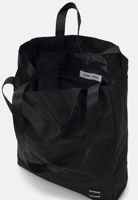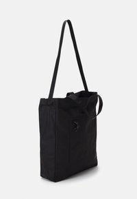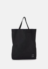 Sac fourre-tout rectangulaire noir avec deux bretelles et petit logo blanc en bas à droite sur fond uni.
