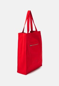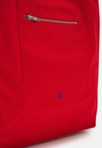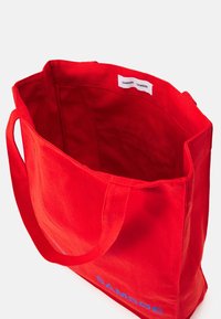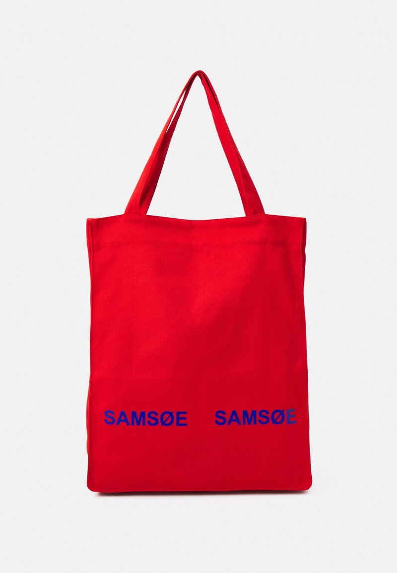 Sac fourre-tout en tissu rouge avec deux anses et texte bleu « SAMSØE SAMSØE » imprimé près du centre en bas.