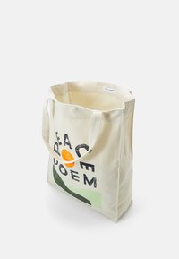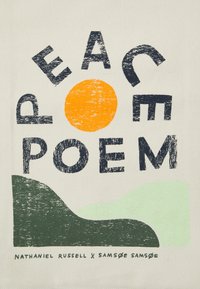 Sac fourre-tout en toile avec le texte « PEACE POEM », un cercle orange et des formes vertes abstraites sur un fond clair.