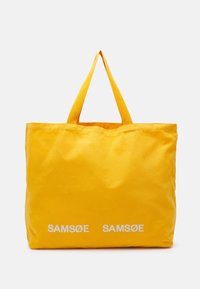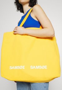 Personne en débardeur bleu tenant un grand sac fourre-tout jaune avec le texte blanc "SAMSØE SAMSØE", portant un jean bleu clair sur fond blanc.