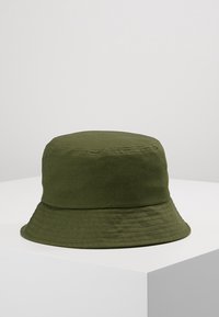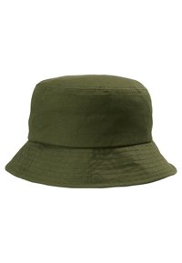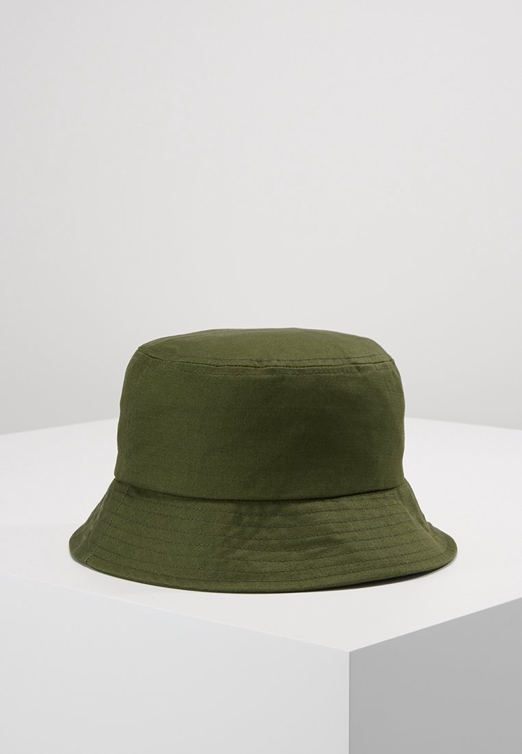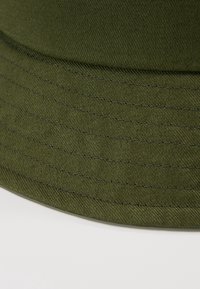 Chapeau bob en coton vert olive avec bord cousu exposé sur un piédestal blanc sur un fond uni.