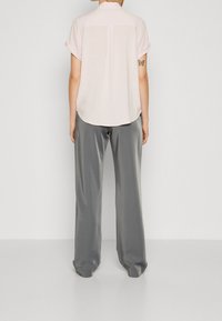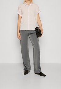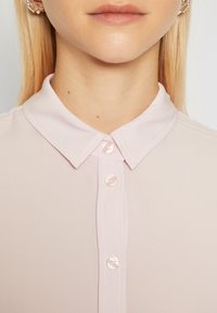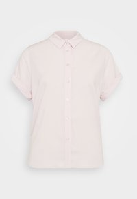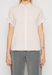 Chemise rose clair à manches courtes avec col pointu, fermeture à boutons sur le devant et manches retroussées, en tissu doux et lisse.