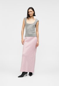 Débardeur gris côtelé avec un large décolleté en U et des manches courtes, silhouette ajustée. Associé à une jupe texturée rose clair.