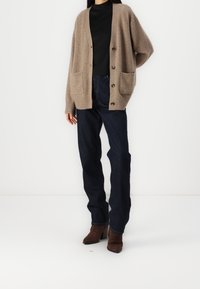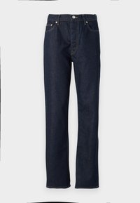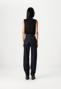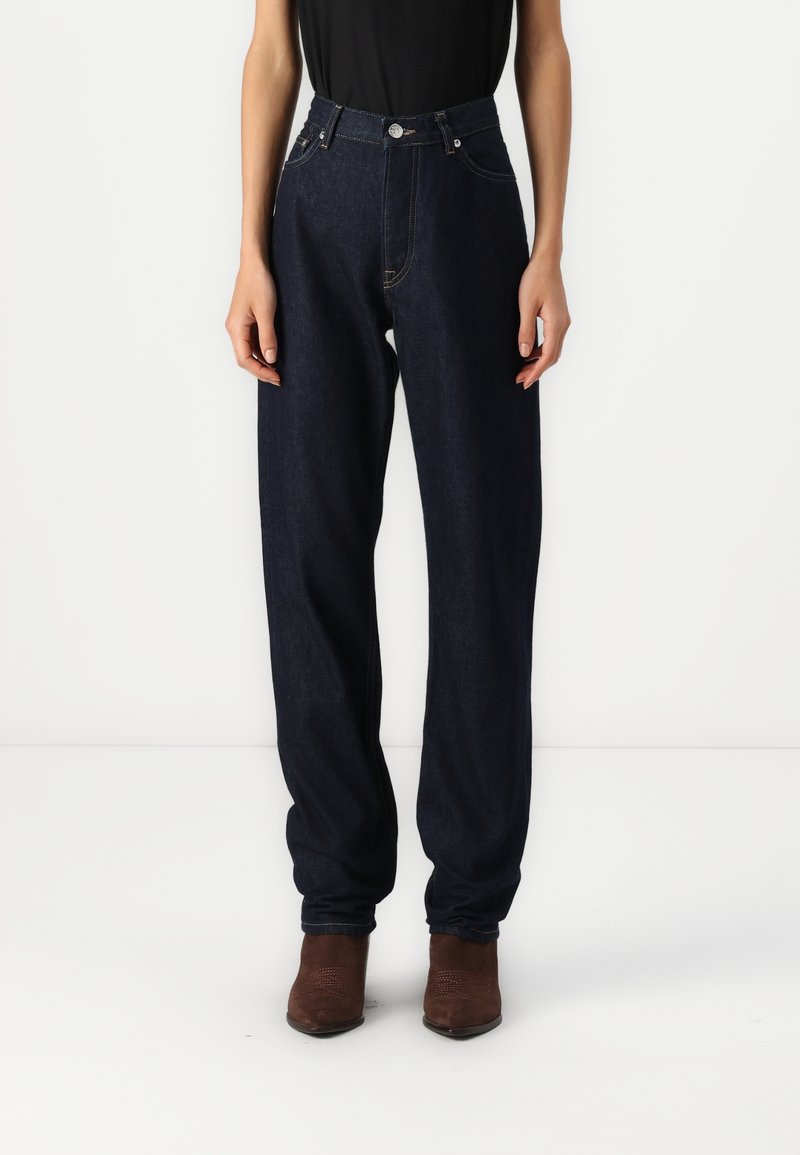 Jean en denim bleu foncé taille haute avec une coupe décontractée, comprenant des poches avant et une fermeture par boutons. Porté avec des bottines marron.