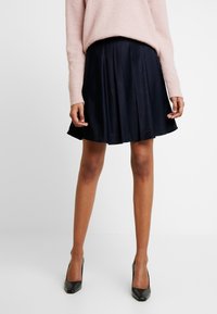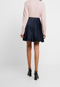 Jupe plissée noire à texture lisse, associée à un pull rose clair. La jupe tombe au-dessus des genoux et présente une coupe évasée.