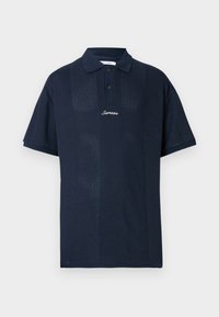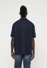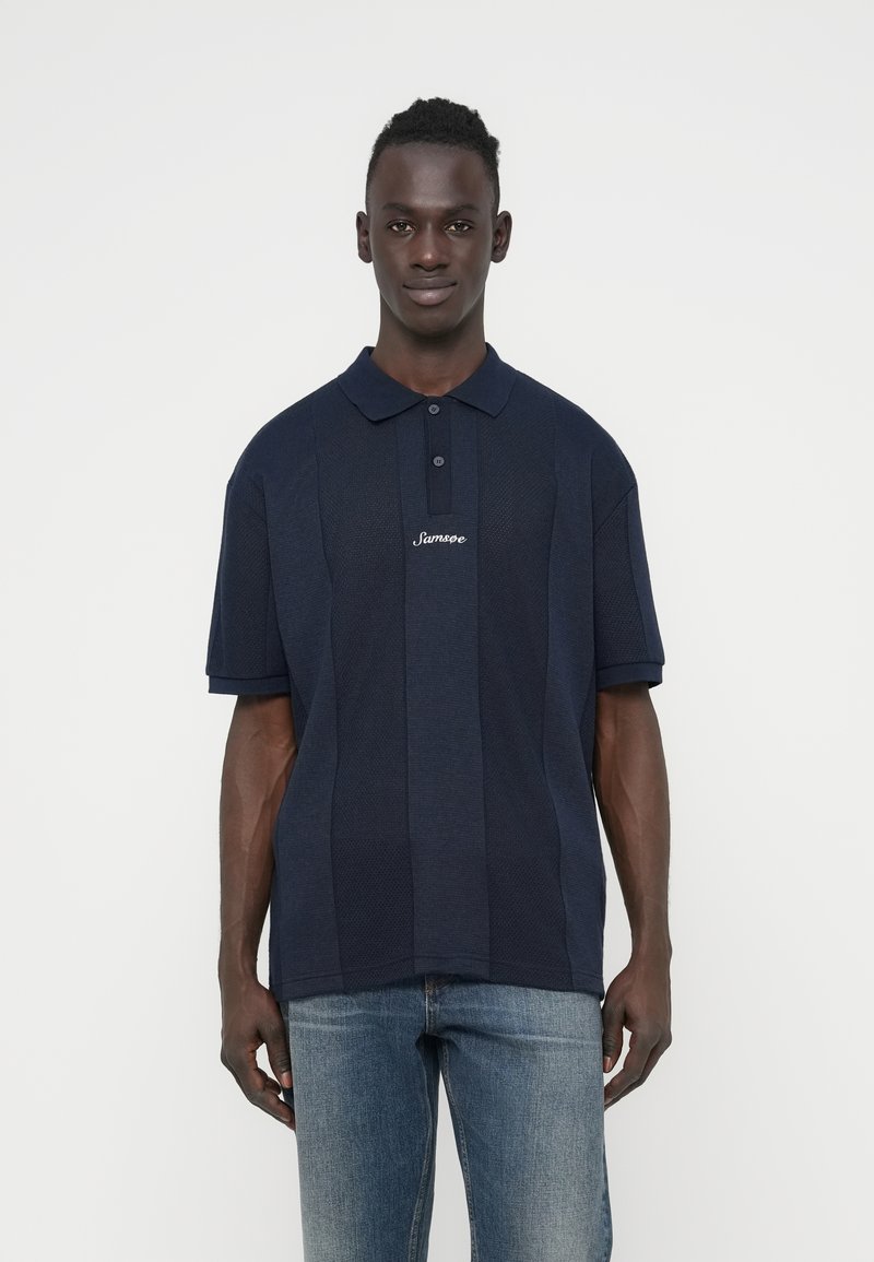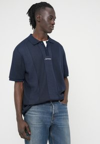 Polo bleu marine à manches courtes avec un design en tricot texturé, doté d'une patte de boutonnage à trois boutons et d'un logo brodé sur la poitrine.