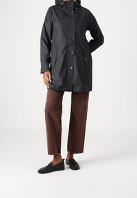 Personne portant un imperméable noir à capuche arrivant aux genoux, un pantalon large marron et des mocassins noirs sur un fond blanc uni.