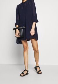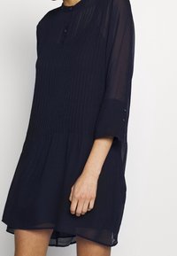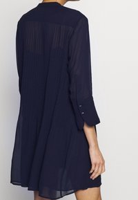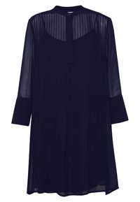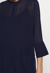 Robe bleu marine, transparente avec un design plissé, encolure rond, et manches trois-quarts avec des détails de boutons aux poignets.