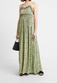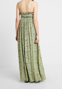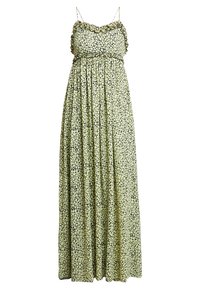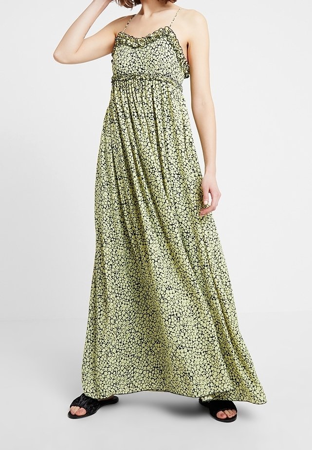 Robe maxi de couleur vert clair avec un imprimé floral noir, présentant des bretelles fines, un corsage froncé et un design fluide.