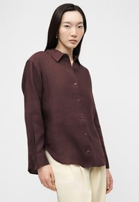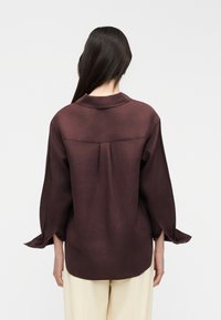 Femme portant une chemise boutonnée marron foncé avec de larges poignets et un pantalon large couleur crème, debout devant un fond blanc uni.
