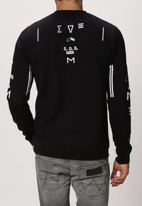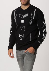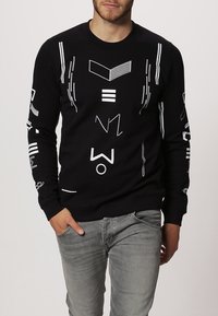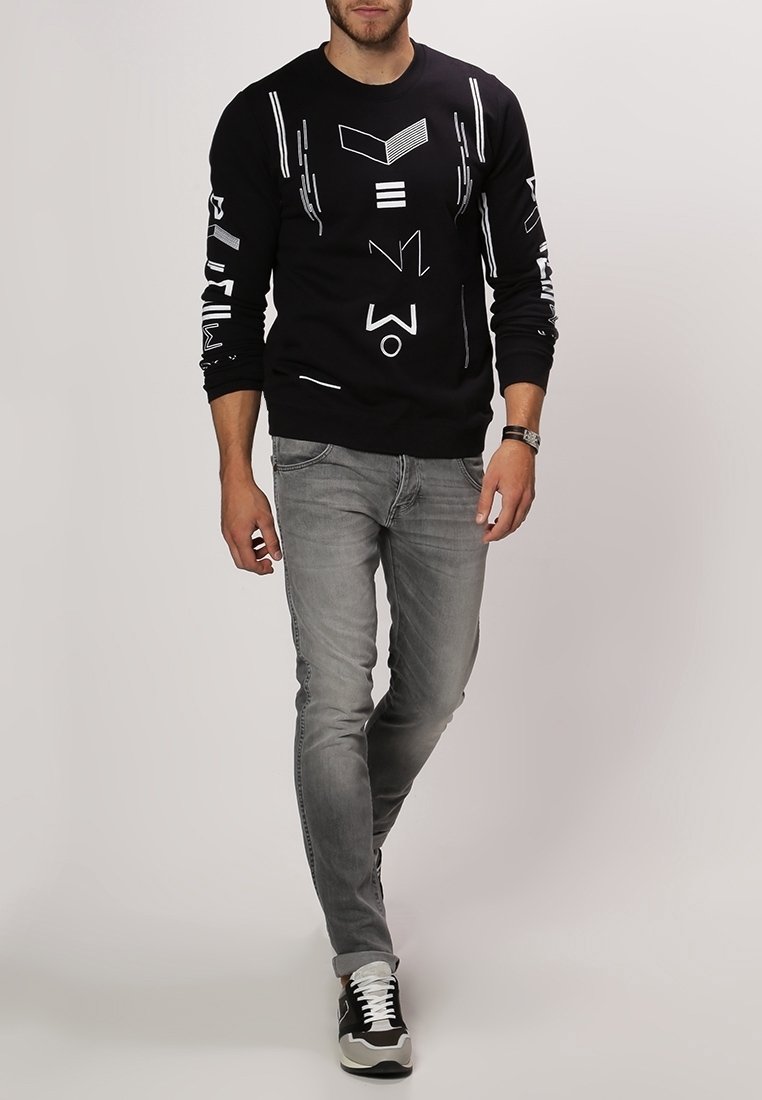 Homme marchant portant un sweat-shirt noir avec des symboles abstraits blancs, un jean slim gris, des baskets noires et blanches, et une montre-bracelet.