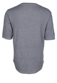 T-shirt gris à manches courtes en tissu léger et texturé, avec un col rond et un ourlet arrière légèrement allongé.