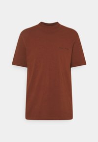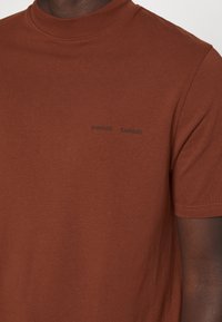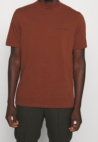T-shirt en coton marron avec un col montant et des manches courtes. Présente un logo noir discret sur la poitrine. Design simple et ajusté sans motifs.