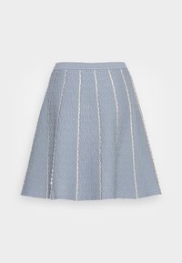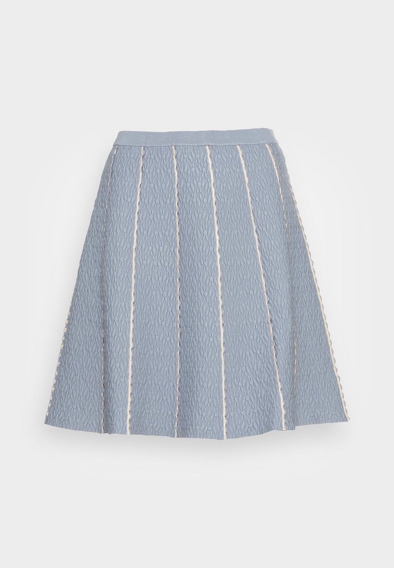 Jupe trapèze bleu clair en tissu texturé avec des rayures verticales couleur crème, dotée d'une ceinture ajustée et d'un ourlet arrivant au genou.