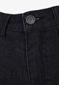 Jean flare en denim noir à la texture lisse, doté d'une jambe large, de coutures minimalistes et d'une ceinture à boucle argentée ornée de clous.