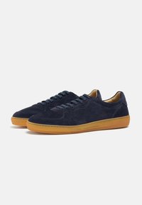 Baskets basses en daim bleu marine avec semelle en caoutchouc marron et lacets bleu marine assortis, présentées en profil sur fond blanc.