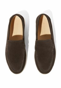 Mocassin en suède marron foncé avec semelle en caoutchouc blanche et couture visible, photographié de côté sur un fond blanc.