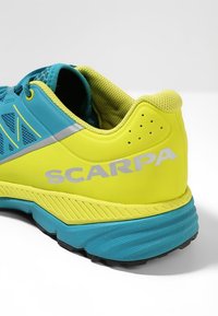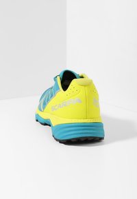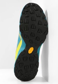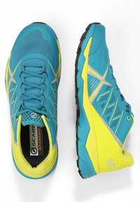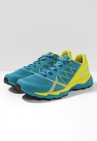 Chaussures de trail légères en teal et jaune. Tige en mesh pour la respirabilité, semelle extérieure en caoutchouc texturé, et accents contrastés.