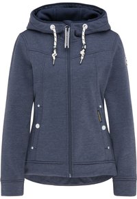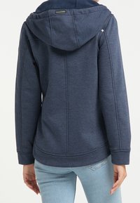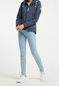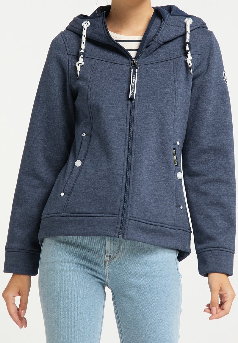 Femme portant un sweat à capuche bleu marine zippé avec des cordons blancs par-dessus une chemise à rayures et un jean bleu clair, debout devant un fond uni.
