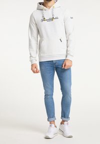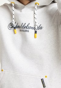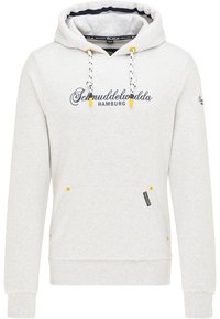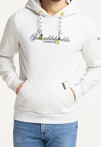 Homme portant un sweat à capuche gris clair avec des cordons noirs et jaunes, texte "Schruddlewudda Hamburg", et un jean bleu, mains dans les poches avant.