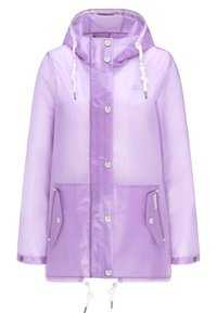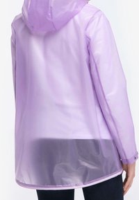 Imperméable violet semi-transparent avec une capuche, des pressions à l'avant, des cordons de serrage ajustables et deux poches à rabat, porté sur un pantalon foncé.