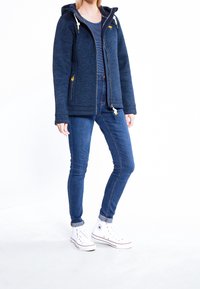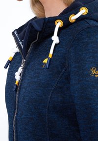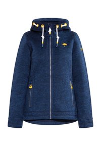 Veste zippée bleu marine avec un tissu texturé, une capuche ajustable et des accents jaunes sur les fermetures éclair et les cordons de serrage.
